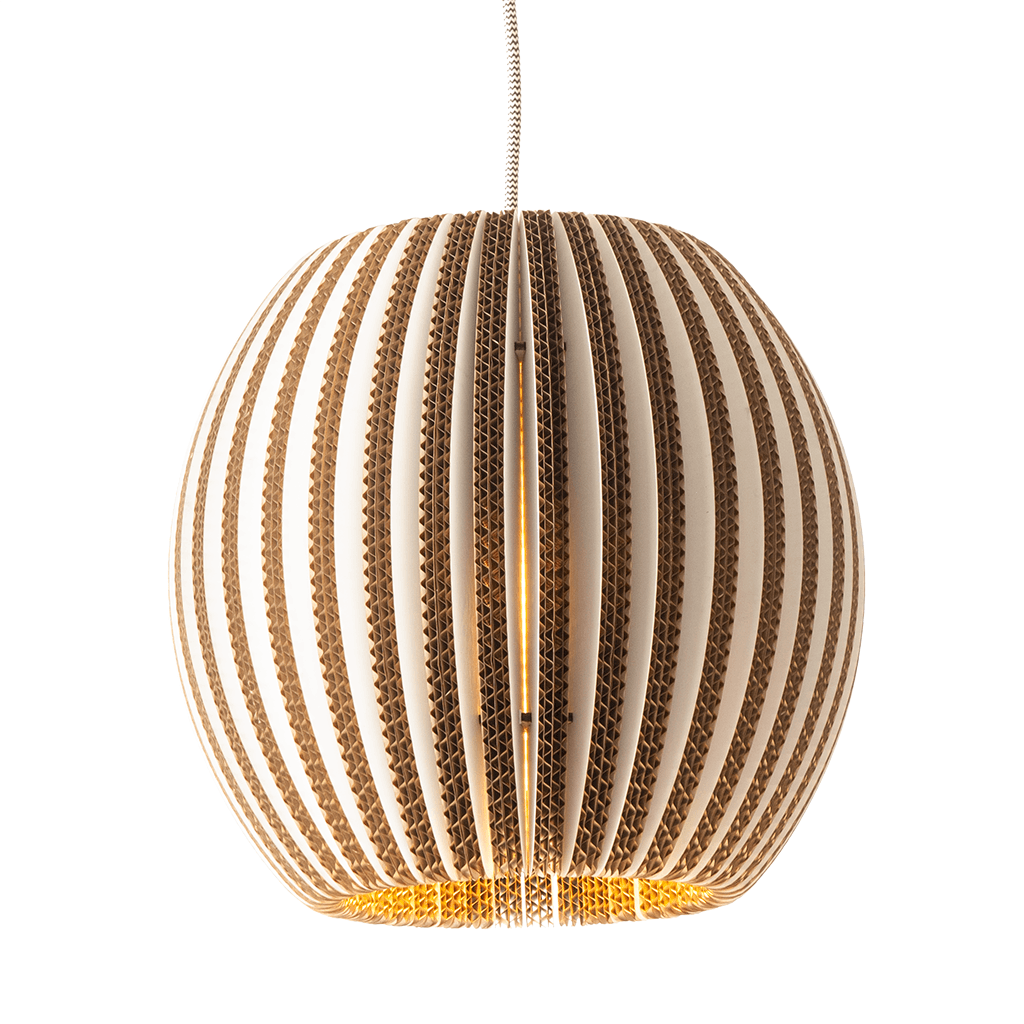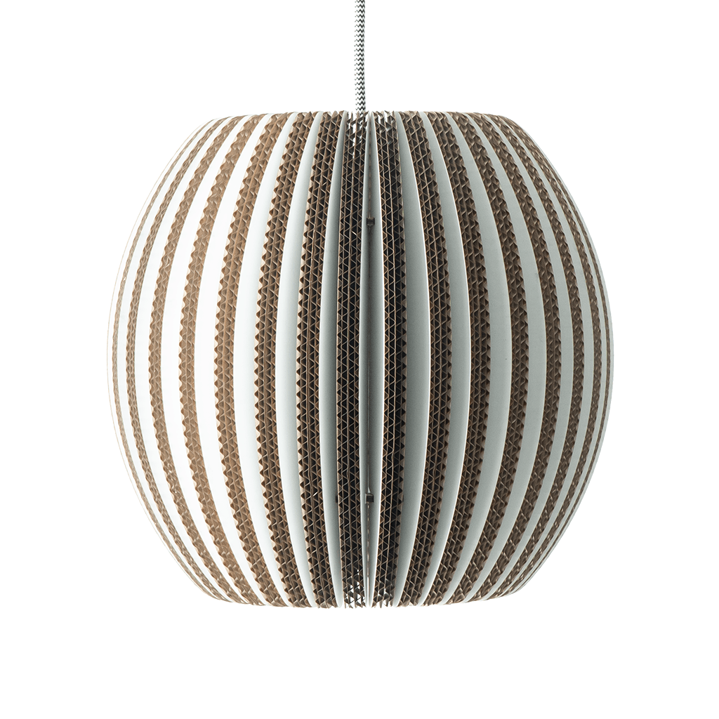 No, this globe isn’t double-round. It’s simply round — but all the slats are made of double layers of thick corrugated cardboard. Almost 33 cm in diameter. Other sizes are possible too, as long as there’s room for a lightbulb. Want to know more? Just ask us.